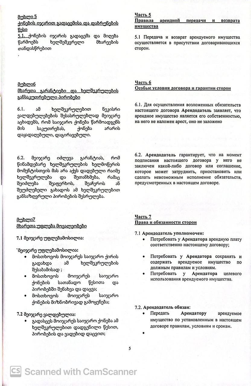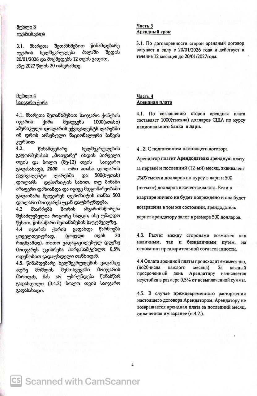 4.1. По соглашению сторон арендная плата составляет 1000 (тысяча) долларов США по курсу национального банка в лари.