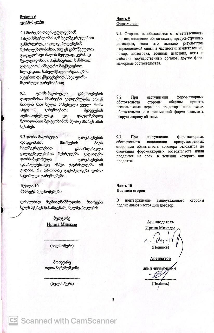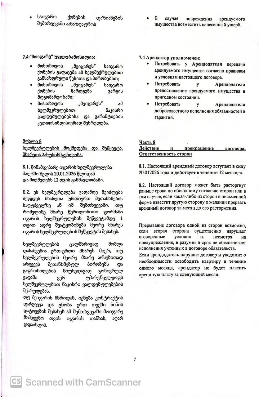 4.2. С подписанием настоящего договора Арендатор платит Арендодателю арендную плату за первый и последний (12-ый) месяц, эквивалент 2000 тысячи долларов по курсу в лари и 500 (пятьсот) долларов в качестве залога. Если в квартире ничего не будет повреждено и она будет возвращена в том же состоянии, арендодатель вернет арендатору залог в размере 500 долларов.