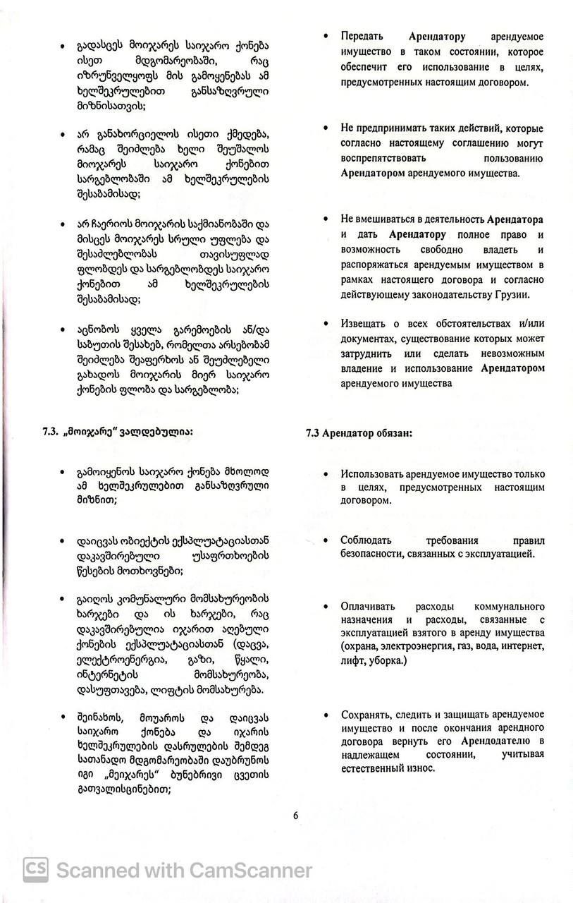 - Не вмешиваться в деятельность Арендатора и дать Арендатору полное право и возможность свободно владеть и распоряжаться арендуемым имуществом в рамках настоящего договора и согласно действующему законодательству Грузии.