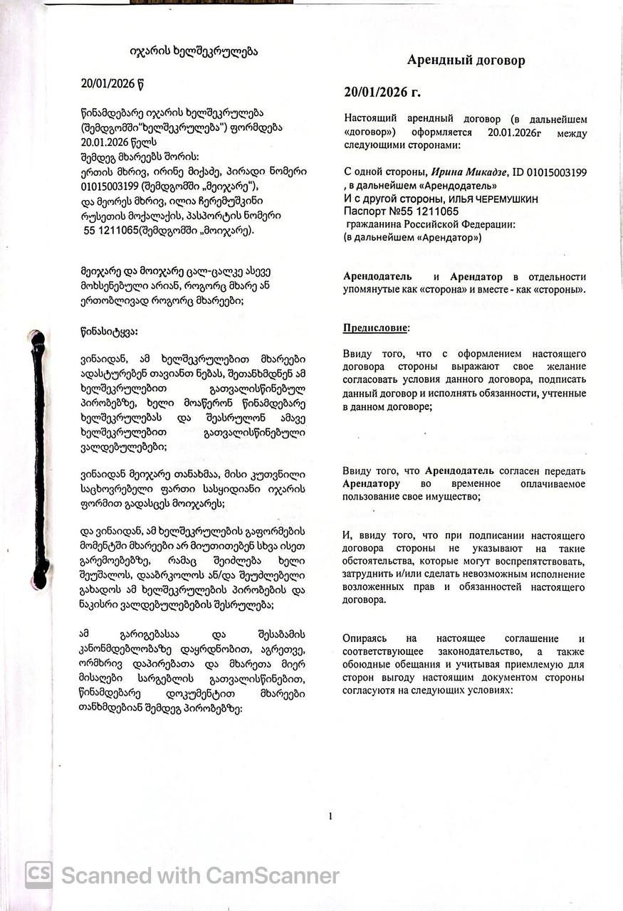 С одной стороны, Ирина Микадзе, ID 01015003199, в дальнейшем «Арендодатель» И с другой стороны, ИЛЬЯ ЧЕРЕМУШКИН, Паспорт №55 1211065, гражданина Российской Федерации, в дальнейшем «Арендатор»